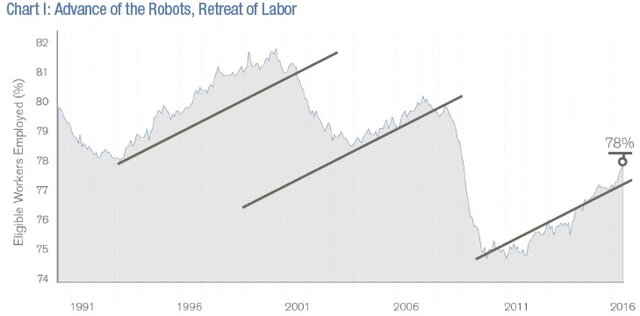 Другими словами, если вместо людей будут работать роботы, наша культура будет меняться вместе с процессом, и в этой ситуации, власти должны адаптироваться к изменениям. В качестве доказательства данных, структурные изменения могут привести график, который показывает отношение числа трудоустроенных людей в общей численности населения США. Здесь прослеживается вполне видны тенденции. Сегодня в США работает 78% трудоспособного населения в возрасте от 25 до 54 лет по сравнению с пиком, достигнутым в 2000 году. на уровне 82%.